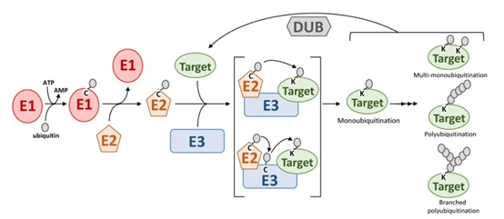 目前已在人类发现的有600多种E3连接酶;在稳定状态下,可以检测到数千个细胞内蛋白上的20000个泛素化位点(Clague et al., 2015; Kim et al., 2011; Udeshi et al., 2013);