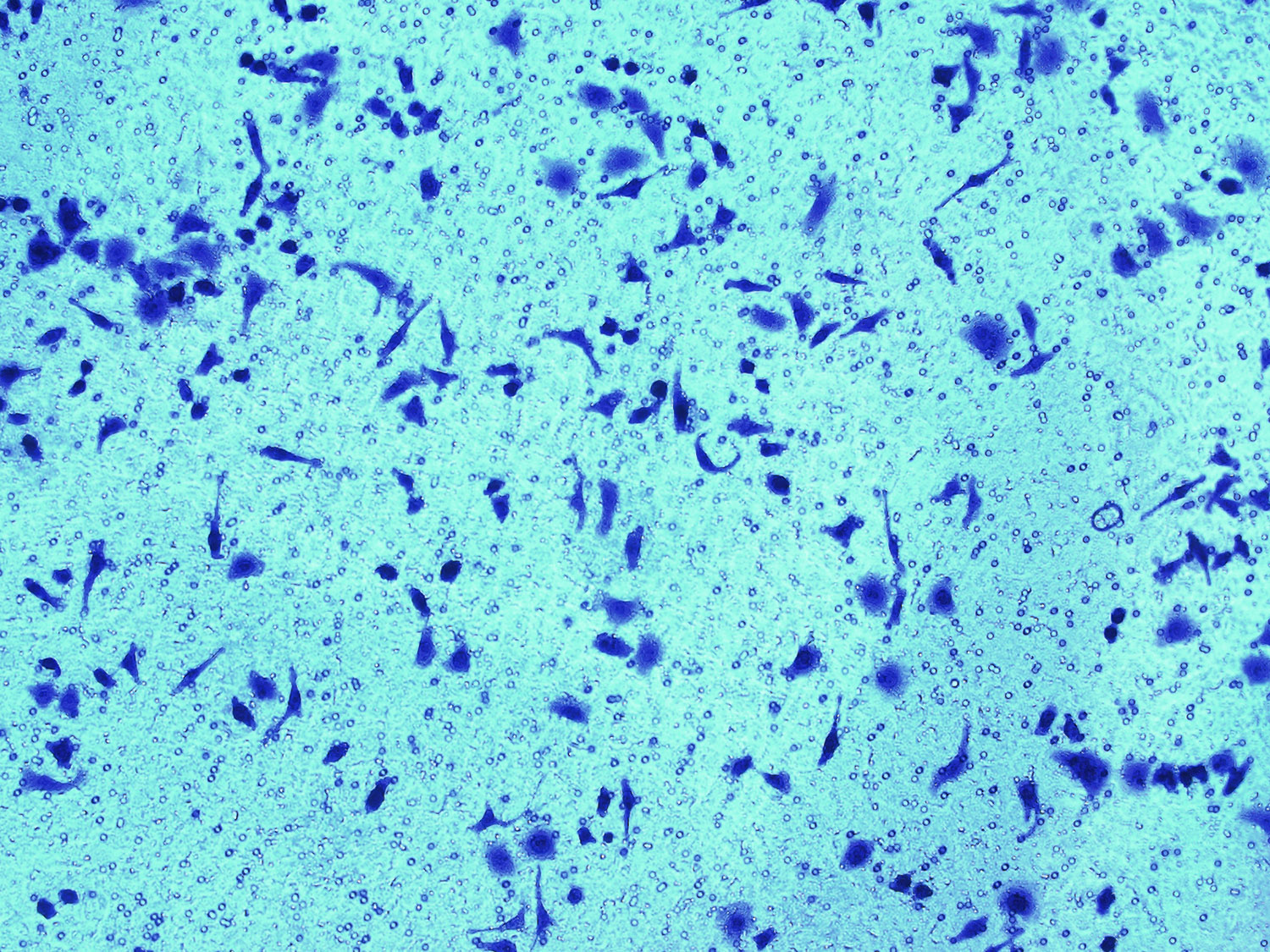 实验原理:将细胞种于上室,趋化因子等种于下室,细胞会向营养成分高的下室跑。与迁移实验不同是侵袭实验需要在小室聚碳酸酯膜上铺设一层基质胶。用以模仿体内细胞外基质,细胞欲进入下室,先要分泌基质金属蛋白酶(MMPs)将基质胶降解,方可通过聚碳酸酯膜。计数进入下室的细胞量可反映肿瘤细胞的侵袭能力。