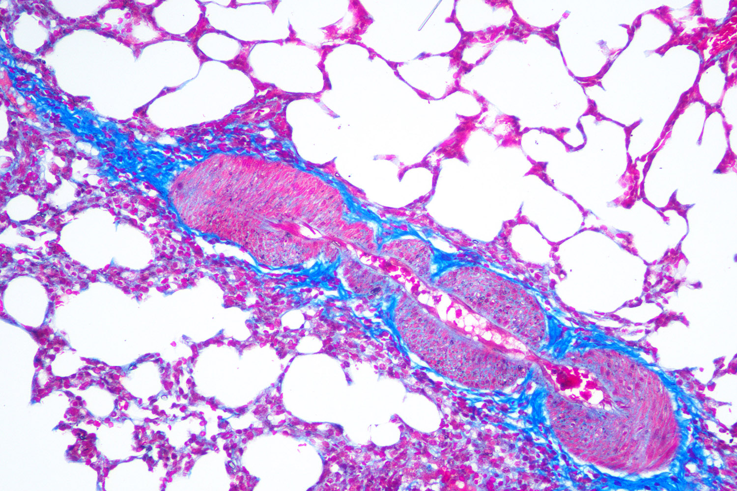 Masson染色用于胶原纤维和肌纤维的染色及鉴定;染色结果:胶原纤维呈蓝色、肌纤维呈红色、细胞核呈蓝黑色。